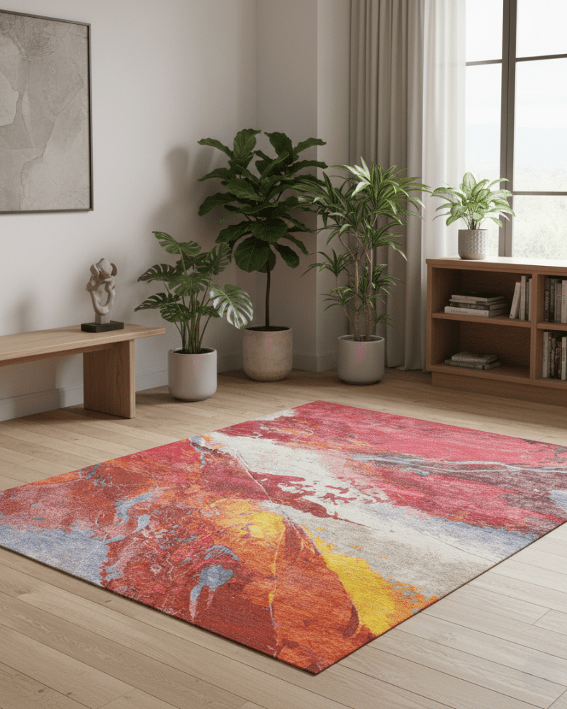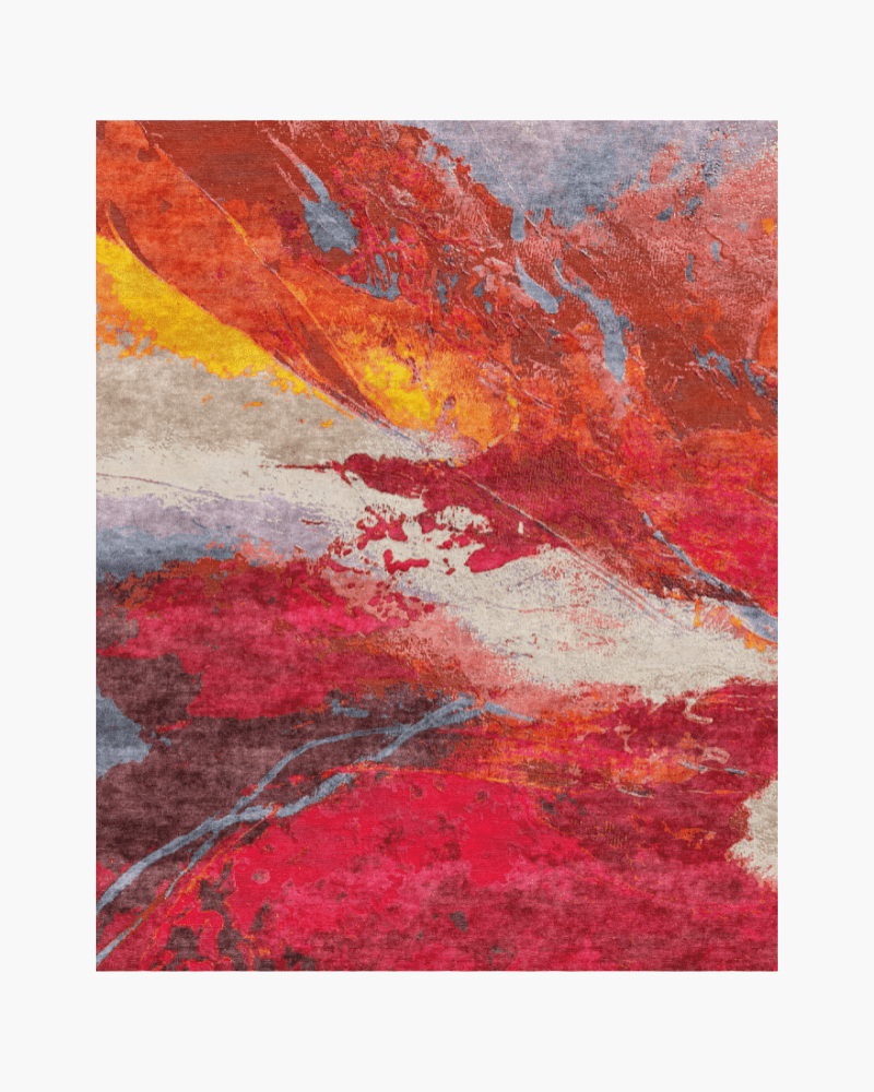Ember Cascade is a bold abstract area rug featuring vibrant shades of red, orange, and gold that flow like molten embers. Designed to add warmth and artistic flair to any space, it makes a striking statement in living rooms, dining areas, or bedrooms. Crafted with premium materials for lasting beauty and comfort.