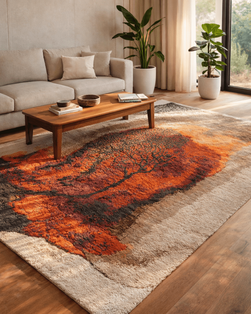 Ember Silhouette is a bold statement piece inspired by the raw beauty of fire and earth. With deep ember reds, burnt orange tones, and smoky neutrals, this rug creates a dramatic focal point in any space.